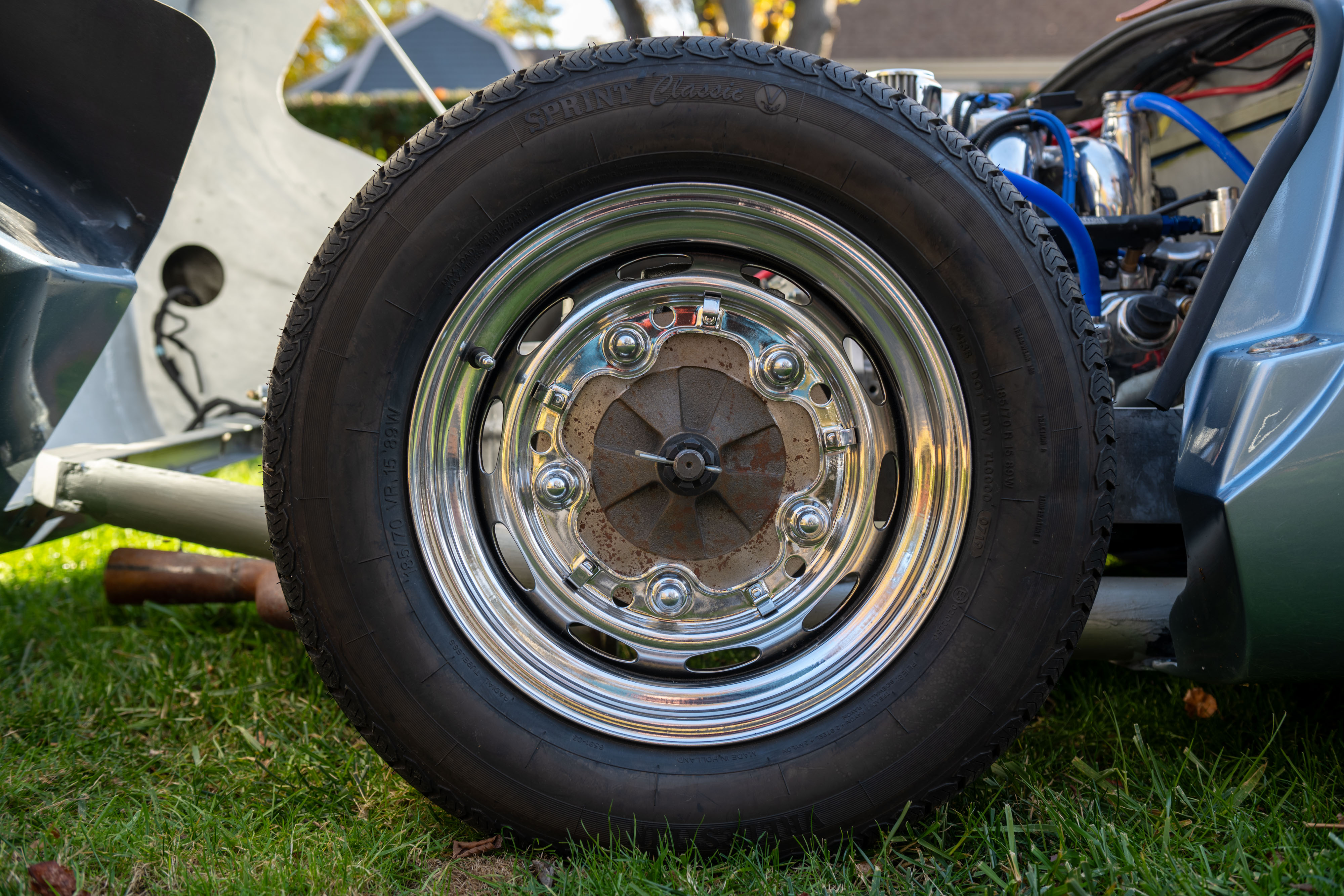The body and chassis of this Beck 550 Spyder were reportedly manufactured in 1984 and stored for many years before being acquired by the current owner in 2024. A 2.6L Subaru flat-four and four-speed manual transaxle with a hardened gear set have since been installed, and the car was painted silver with blue rear darts.