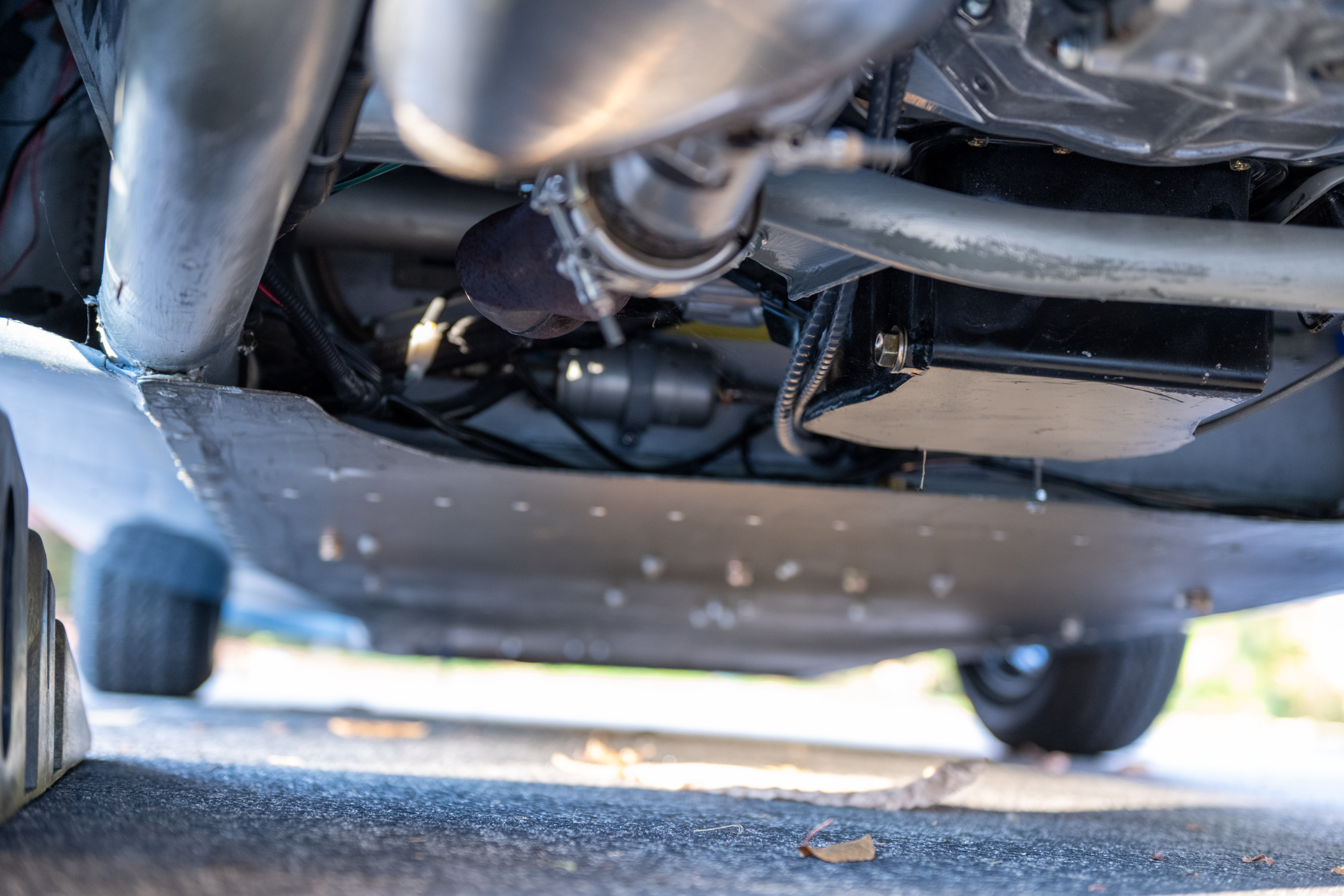 It rides on 15″ wide-five steel wheels with three-way power adjustable suspension and power-assisted disc brakes. Inside, the cabin houses heated fixed-back blue leather seats with custom stitching along with a Bluetooth stereo, a wood-rimmed steering wheel, and Speedhut gauges.