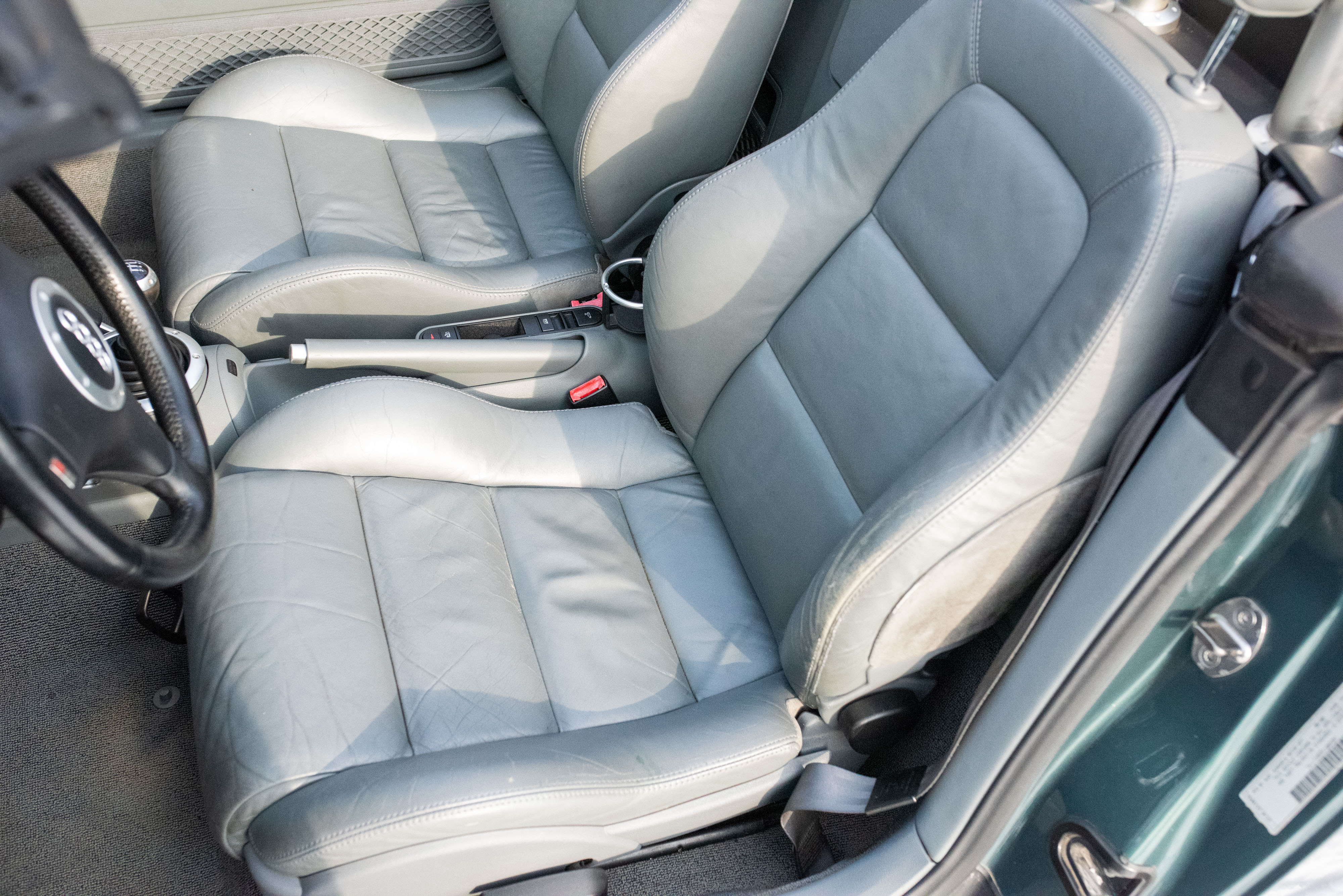 This 2001 Audi TT Roadster has 64k miles following registration history in New York and Connecticut, and it was specified in Desert Green Pearl Effect over Aviator Gray leather upholstery. Power is provided by a turbocharged 1.8-liter inline-four linked with a six-speed manual transaxle and a Quattro all-wheel-drive system. The car is equipped with a black soft top, 17" five-spoke alloy wheels, integrated fog lights, an Audi Concert cassette stereo, heated front seats, a Bose sound system, and automatic climate control.